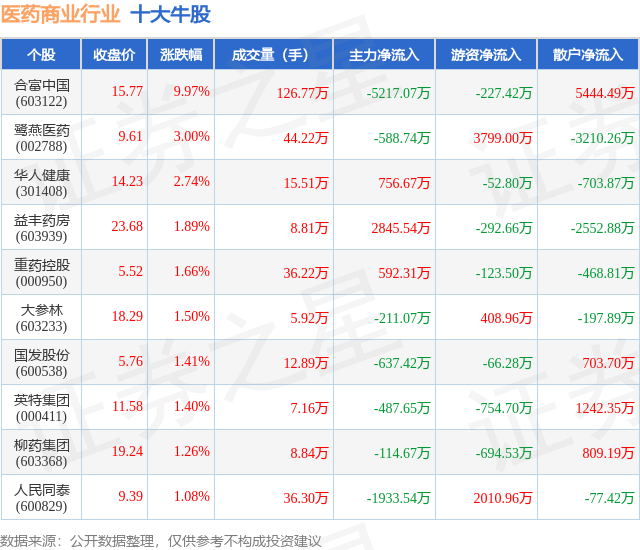 个股表现方面,医药商业行业当日领涨股为合富中国(603122),该股当日报收15.77,上涨9.97%,成交量126.77万,主力资金净流出5217.07万元。鹭燕医药(002788)以上涨3.0%紧随其后,该股当日成交量44.22万,主力资金净流出588.74万元。除此之外,华人健康(301408)、益丰药房(603939)、重药控股(000950)均进入当日牛股之列。具体个股列表见下表: