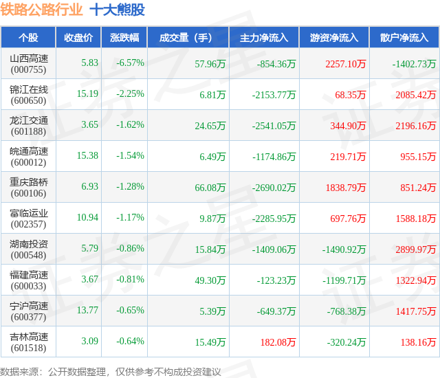 个股表现方面,铁路公路行业当日领跌股为山西高速(000755),该股当日报收5.83,下跌6.57%,成交量57.96万,主力资金净流出854.36万元。锦江在线(600650)以下跌2.25%紧随其后,该股当日成交量6.81万,主力资金净流出2153.77万元。除此之外,龙江交通(601188)、皖通高速(600012)、重庆路桥(600106)均进入当日熊股之列。具体个股列表见下表: