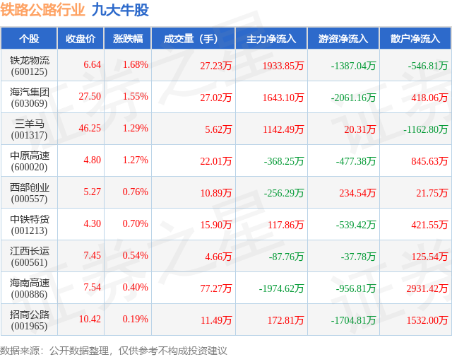 个股表现方面,铁路公路行业当日领涨股为铁龙物流(600125),该股当日报收6.64,上涨1.68%,成交量27.23万,主力资金净流入1933.85万元。海汽集团(603069)以上涨1.55%紧随其后,该股当日成交量27.02万,主力资金净流入1643.1万元。除此之外,三羊马(001317)、中原高速(600020)、西部创业(000557)均进入当日牛股之列。具体个股列表见下表:
