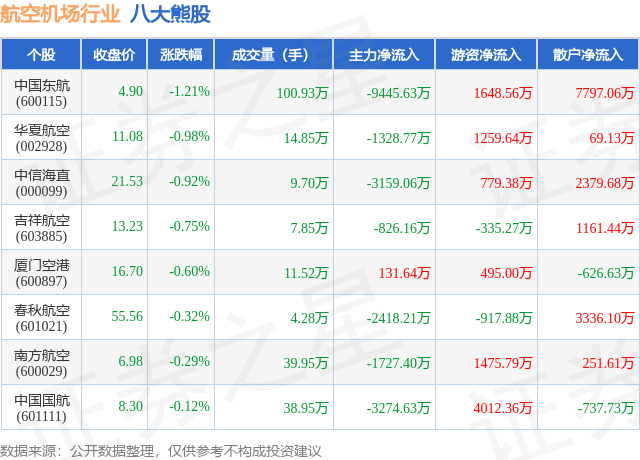 个股表现方面,航空机场行业当日领跌股为中国东航(600115),该股当日报收4.9,下跌1.21%,成交量100.93万,主力资金净流出9445.63万元。华夏航空(002928)以下跌0.98%紧随其后,该股当日成交量14.85万,主力资金净流出1328.77万元。除此之外,中信海直(000099)、吉祥航空(603885)、厦门空港(600897)均进入当日熊股之列。具体个股列表见下表: