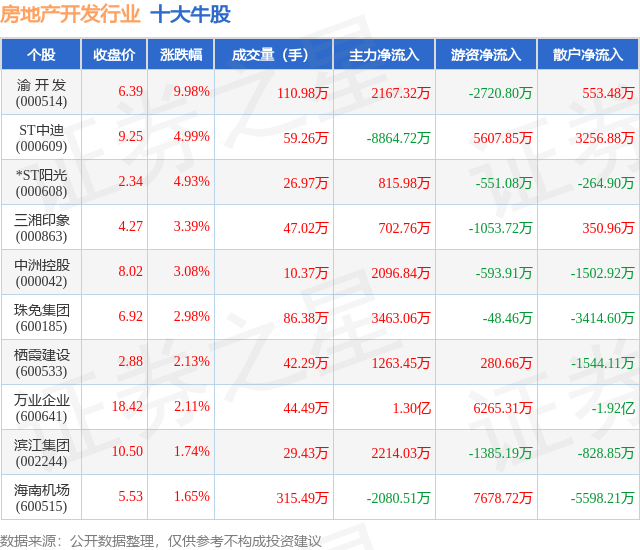 个股表现方面,房地产开发行业当日领涨股为渝 开 发(000514),该股当日报收6.39,上涨9.98%,成交量110.98万,主力资金净流入2167.32万元。ST中迪(000609)以上涨4.99%紧随其后,该股当日成交量59.26万,主力资金净流出8864.72万元。除此之外,*ST阳光(000608)、三湘印象(000863)、中洲控股(000042)均进入当日牛股之列。具体个股列表见下表: