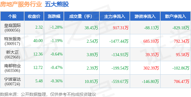 个股表现方面,房地产服务行业当日领跌股为皇庭国际(000056),该股当日报收2.32,下跌1.28%,成交量38.45万,主力资金净流入917.31万元。特发服务(300917)以下跌1.19%紧随其后,该股当日成交量2.54万,主力资金净流出1477.44万元。除此之外,新大正(002968)、南都物业(603506)、宁波富达(600724)均进入当日熊股之列。具体个股列表见下表: