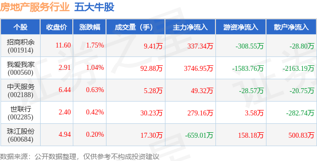 个股表现方面,房地产服务行业当日领涨股为招商积余(001914),该股当日报收11.6,上涨1.75%,成交量9.41万,主力资金净流入337.34万元。我爱我家(000560)以上涨1.04%紧随其后,该股当日成交量92.88万,主力资金净流入3746.95万元。除此之外,中天服务(002188)、世联行(002285)、珠江股份(600684)均进入当日牛股之列。具体个股列表见下表: