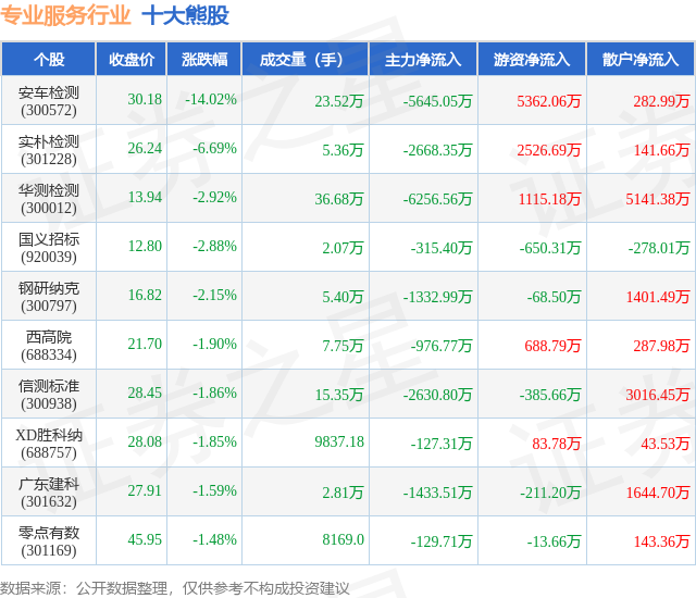 个股表现方面,专业服务行业当日领跌股为安车检测(300572),该股当日报收30.18,下跌14.02%,成交量23.52万,主力资金净流出5645.05万元。实朴检测(301228)以下跌6.69%紧随其后,该股当日成交量5.36万,主力资金净流出2668.35万元。除此之外,华测检测(300012)、国义招标(920039)、钢研纳克(300797)均进入当日熊股之列。具体个股列表见下表: