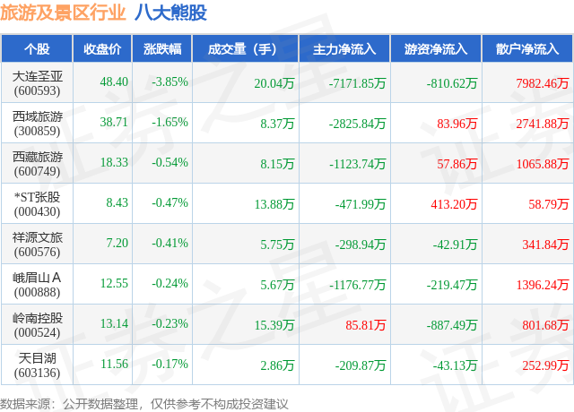 个股表现方面,旅游及景区行业当日领跌股为大连圣亚(600593),该股当日报收48.4,下跌3.85%,成交量20.04万,主力资金净流出7171.85万元。西域旅游(300859)以下跌1.65%紧随其后,该股当日成交量8.37万,主力资金净流出2825.84万元。除此之外,西藏旅游(600749)、*ST张股(000430)、祥源文旅(600576)均进入当日熊股之列。具体个股列表见下表: