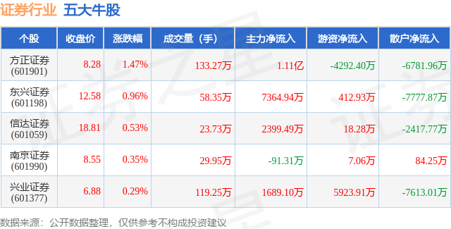 个股表现方面,证券行业当日领涨股为方正证券(601901),该股当日报收8.28,上涨1.47%,成交量133.27万,主力资金净流入1.11亿元。东兴证券(601198)以上涨0.96%紧随其后,该股当日成交量58.35万,主力资金净流入7364.94万元。除此之外,信达证券(601059)、南京证券(601990)、兴业证券(601377)均进入当日牛股之列。具体个股列表见下表: