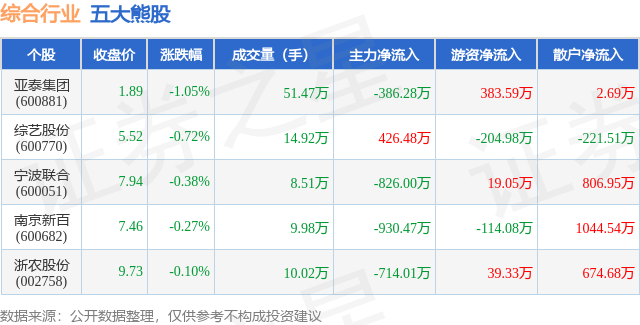 个股表现方面,综合行业当日领跌股为亚泰集团(600881),该股当日报收1.89,下跌1.05%,成交量51.47万,主力资金净流出386.28万元。综艺股份(600770)以下跌0.72%紧随其后,该股当日成交量14.92万,主力资金净流入426.48万元。除此之外,宁波联合(600051)、南京新百(600682)、浙农股份(002758)均进入当日熊股之列。具体个股列表见下表: