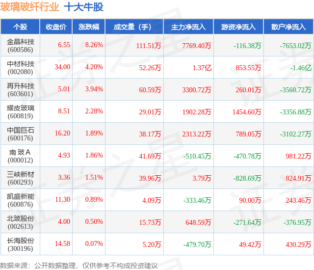 个股表现方面,玻璃玻纤行业当日领涨股为金晶科技(600586),该股当日报收6.55,上涨8.26%,成交量111.51万,主力资金净流入7769.4万元。中材科技(002080)以上涨4.2%紧随其后,该股当日成交量52.26万,主力资金净流入1.37亿元。除此之外,再升科技(603601)、耀皮玻璃(600819)、中国巨石(600176)均进入当日牛股之列。具体个股列表见下表: