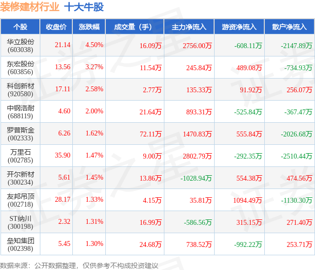 个股表现方面,装修建材行业当日领涨股为华立股份(603038),该股当日报收21.14,上涨4.5%,成交量16.09万,主力资金净流入2756.0万元。东宏股份(603856)以上涨3.27%紧随其后,该股当日成交量11.54万,主力资金净流入245.84万元。除此之外,科创新材(920580)、中钢洛耐(688119)、罗普斯金(002333)均进入当日牛股之列。具体个股列表见下表: