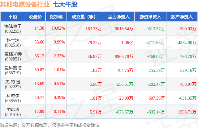 个股表现方面,其他电源设备行业当日领涨股为海陆重工(002255),该股当日报收14.38,上涨10.02%,成交量163.33万,主力资金净流入9013.54万元。科士达(002518)以上涨9.99%紧随其后,该股当日成交量29.22万,主力资金净流入1.06亿元。除此之外,麦格米特(002851)、爱科赛博(688719)、奥 特 迅(002227)均进入当日牛股之列。具体个股列表见下表: