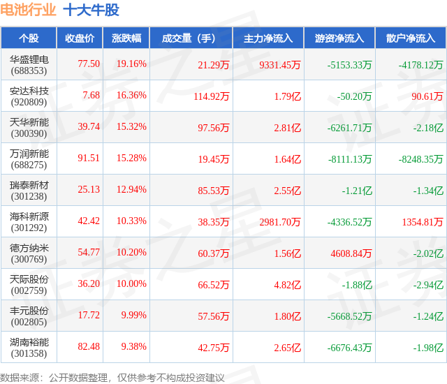个股表现方面,电池行业当日领涨股为华盛锂电(688353),该股当日报收77.5,上涨19.16%,成交量21.29万,主力资金净流入9331.45万元。安达科技(920809)以上涨16.36%紧随其后,该股当日成交量114.92万,主力资金净流入1.79亿元。除此之外,天华新能(300390)、万润新能(688275)、瑞泰新材(301238)均进入当日牛股之列。具体个股列表见下表: