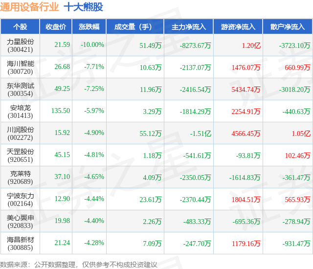 个股表现方面,通用设备行业当日领跌股为力星股份(300421),该股当日报收21.59,下跌10.0%,成交量51.49万,主力资金净流出8273.67万元。海川智能(300720)以下跌7.71%紧随其后,该股当日成交量10.63万,主力资金净流出2137.07万元。除此之外,东华测试(300354)、安培龙(301413)、川润股份(002272)均进入当日熊股之列。具体个股列表见下表: