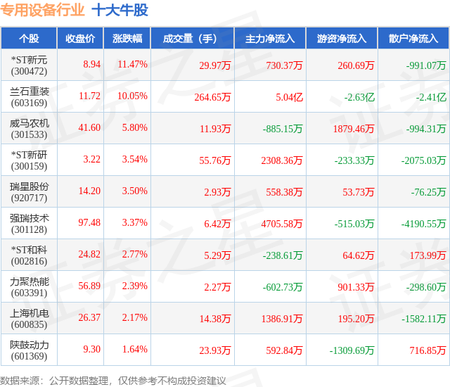 个股表现方面,专用设备行业当日领涨股为*ST新元(300472),该股当日报收8.94,上涨11.47%,成交量29.97万,主力资金净流入730.37万元。兰石重装(603169)以上涨10.05%紧随其后,该股当日成交量264.65万,主力资金净流入5.04亿元。除此之外,威马农机(301533)、*ST新研(300159)、瑞星股份(920717)均进入当日牛股之列。具体个股列表见下表: