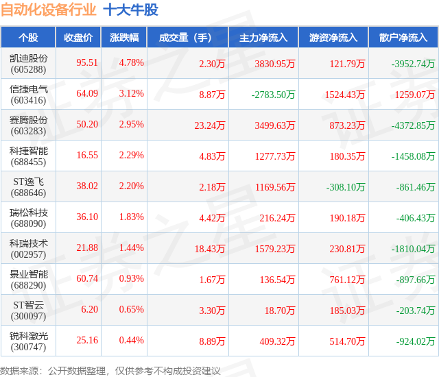 个股表现方面,自动化设备行业当日领涨股为凯迪股份(605288),该股当日报收95.51,上涨4.78%,成交量2.3万,主力资金净流入3830.95万元。信捷电气(603416)以上涨3.12%紧随其后,该股当日成交量8.87万,主力资金净流出2783.5万元。除此之外,赛腾股份(603283)、科捷智能(688455)、ST逸飞(688646)均进入当日牛股之列。具体个股列表见下表: