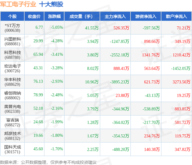 个股表现方面,军工电子行业当日领跌股为*ST万方(000638),该股当日报收6.77,下跌5.05%,成交量41.55万,主力资金净流入526.35万元。兴图新科(688081)以下跌4.28%紧随其后,该股当日成交量3.94万,主力资金净流出1247.85万元。除此之外,科思科技(688788)、宏达电子(300726)、华丰科技(688629)均进入当日熊股之列。具体个股列表见下表: