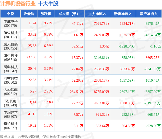 个股表现方面,计算机设备行业当日领涨股为中威电子(300270),该股当日报收11.24,上涨9.77%,成交量47.11万,主力资金净流入7021.78万元。佳缘科技(301117)以上涨6.69%紧随其后,该股当日成交量11.61万,主力资金净流入2439.03万元。除此之外,航天智装(300455)、淳中科技(603516)、朗科科技(300042)均进入当日牛股之列。具体个股列表见下表:
