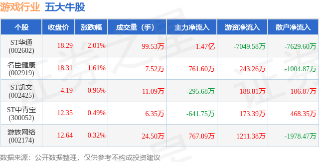 个股表现方面,游戏行业当日领涨股为ST华通(002602),该股当日报收18.29,上涨2.01%,成交量99.53万,主力资金净流入1.47亿元。名臣健康(002919)以上涨1.61%紧随其后,该股当日成交量7.52万,主力资金净流入761.6万元。除此之外,ST凯文(002425)、ST中青宝(300052)、游族网络(002174)均进入当日牛股之列。具体个股列表见下表: