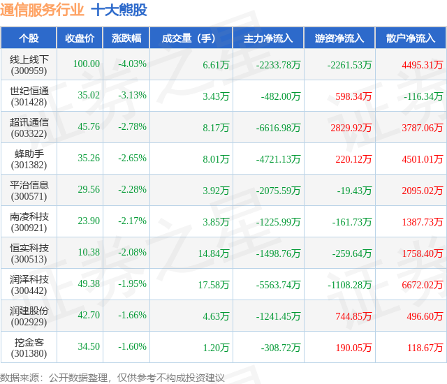个股表现方面,通信服务行业当日领跌股为线上线下(300959),该股当日报收100.0,下跌4.03%,成交量6.61万,主力资金净流出2233.78万元。世纪恒通(301428)以下跌3.13%紧随其后,该股当日成交量3.43万,主力资金净流出482.0万元。除此之外,超讯通信(603322)、蜂助手(301382)、平治信息(300571)均进入当日熊股之列。具体个股列表见下表: