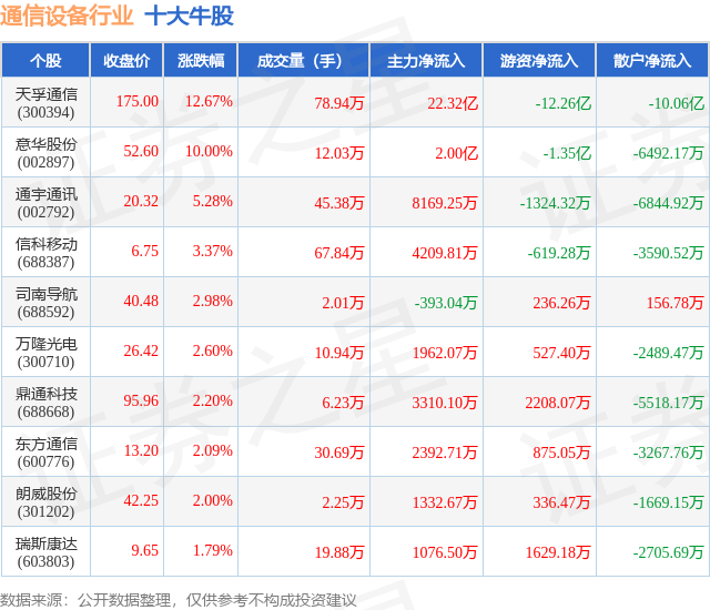 个股表现方面,通信设备行业当日领涨股为天孚通信(300394),该股当日报收175.0,上涨12.67%,成交量78.94万,主力资金净流入22.32亿元。意华股份(002897)以上涨10.0%紧随其后,该股当日成交量12.03万,主力资金净流入2.0亿元。除此之外,通宇通讯(002792)、信科移动(688387)、司南导航(688592)均进入当日牛股之列。具体个股列表见下表: