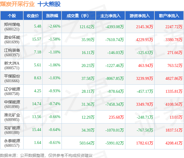 个股表现方面,煤炭开采行业当日领跌股为郑州煤电(600121),该股当日报收5.48,下跌2.66%,成交量121.62万,主力资金净流出4393.08万元。潞安环能(601699)以下跌1.58%紧随其后,该股当日成交量35.99万,主力资金净流出7610.74万元。除此之外,江钨装备(600397)、新大洲A(000571)、平煤股份(601666)均进入当日熊股之列。具体个股列表见下表: