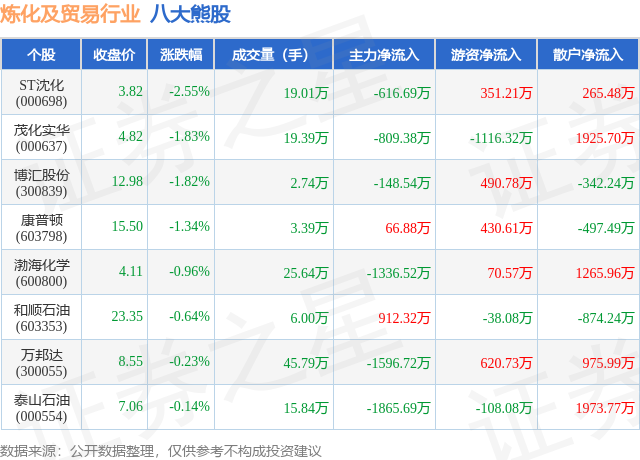 个股表现方面,炼化及贸易行业当日领跌股为ST沈化(000698),该股当日报收3.82,下跌2.55%,成交量19.01万,主力资金净流出616.69万元。茂化实华(000637)以下跌1.83%紧随其后,该股当日成交量19.39万,主力资金净流出809.38万元。除此之外,博汇股份(300839)、康普顿(603798)、渤海化学(600800)均进入当日熊股之列。具体个股列表见下表: