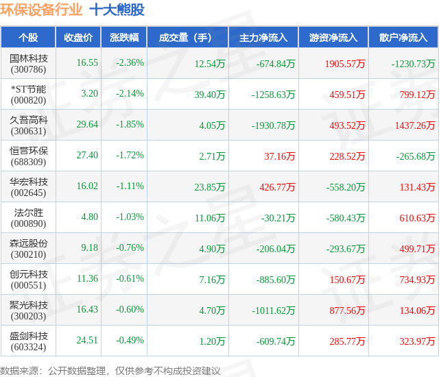 个股表现方面,环保设备行业当日领跌股为国林科技(300786),该股当日报收16.55,下跌2.36%,成交量12.54万,主力资金净流出674.84万元。*ST节能(000820)以下跌2.14%紧随其后,该股当日成交量39.4万,主力资金净流出1258.63万元。除此之外,久吾高科(300631)、恒誉环保(688309)、华宏科技(002645)均进入当日熊股之列。具体个股列表见下表: