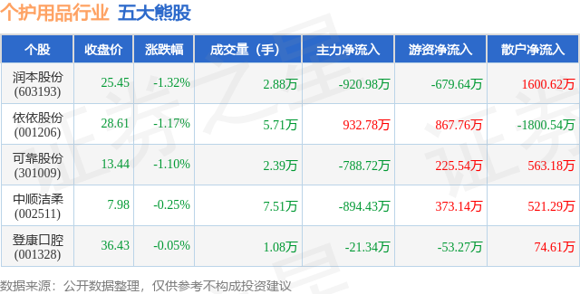 个股表现方面,个护用品行业当日领跌股为润本股份(603193),该股当日报收25.45,下跌1.32%,成交量2.88万,主力资金净流出920.98万元。依依股份(001206)以下跌1.17%紧随其后,该股当日成交量5.71万,主力资金净流入932.78万元。除此之外,可靠股份(301009)、中顺洁柔(002511)、登康口腔(001328)均进入当日熊股之列。具体个股列表见下表: