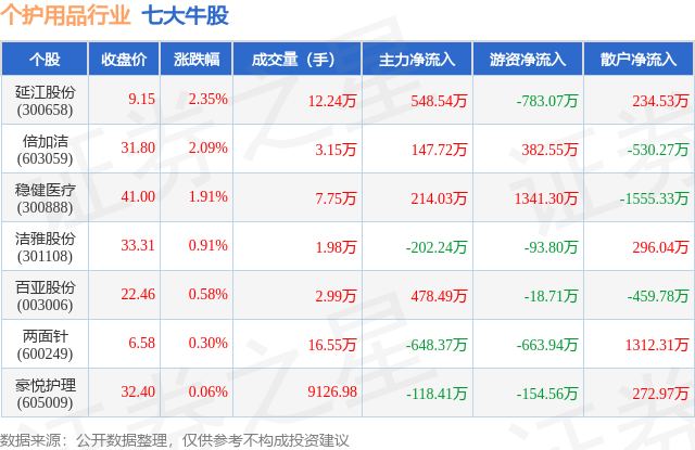 个股表现方面,个护用品行业当日领涨股为延江股份(300658),该股当日报收9.15,上涨2.35%,成交量12.24万,主力资金净流入548.54万元。倍加洁(603059)以上涨2.09%紧随其后,该股当日成交量3.15万,主力资金净流入147.72万元。除此之外,稳健医疗(300888)、洁雅股份(301108)、百亚股份(003006)均进入当日牛股之列。具体个股列表见下表: