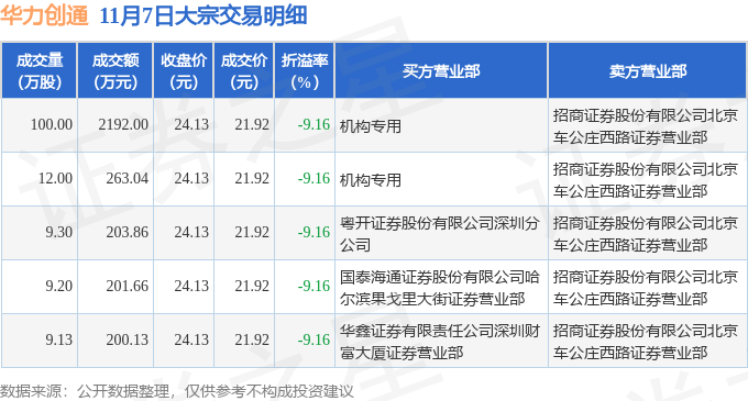 证券之星消息,11月7日华力创通发生大宗交易,交易数据如下: