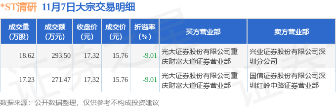 证券之星消息,11月7日*ST清研发生大宗交易,交易数据如下: