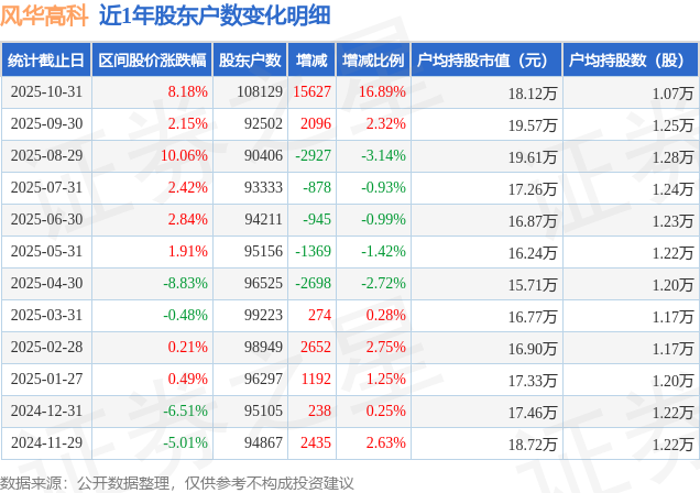 从股价来看,2025年9月30日至2025年10月31日,风华高科区间涨幅为8.18%,在此期间股东户数增加1.56万户,增幅为16.89%。