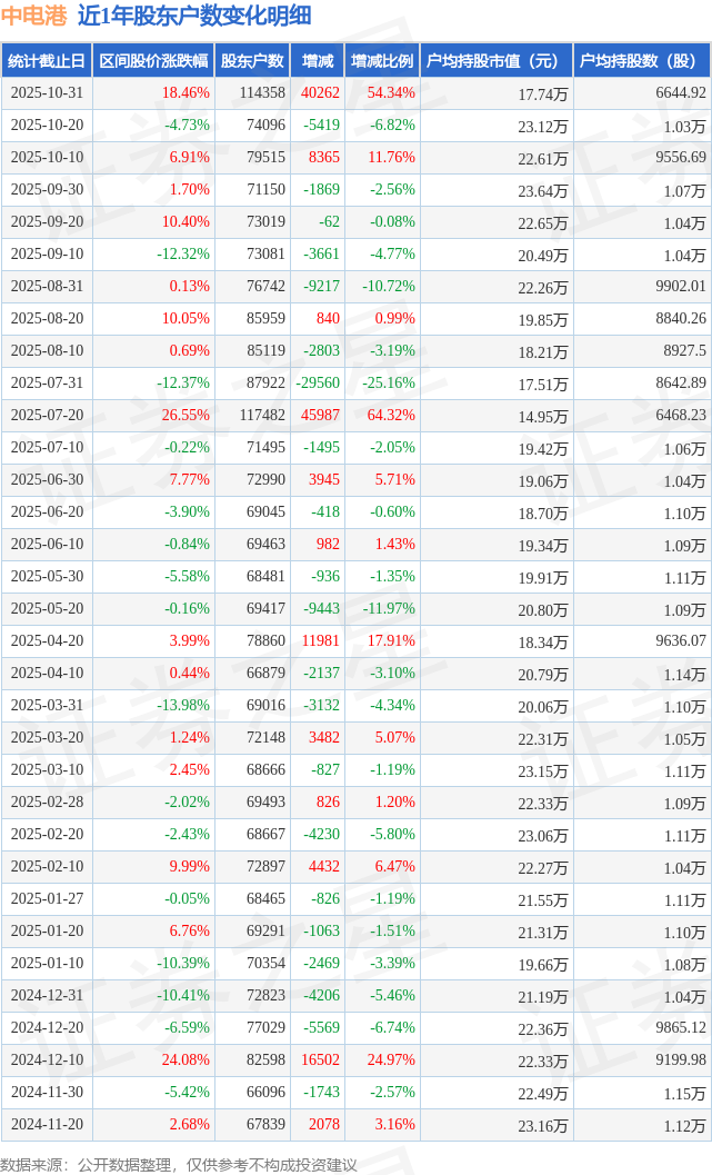 从股价来看,2025年10月20日至2025年10月31日,中电港区间涨幅为18.46%,在此期间股东户数增加4.03万户,增幅为54.34%。