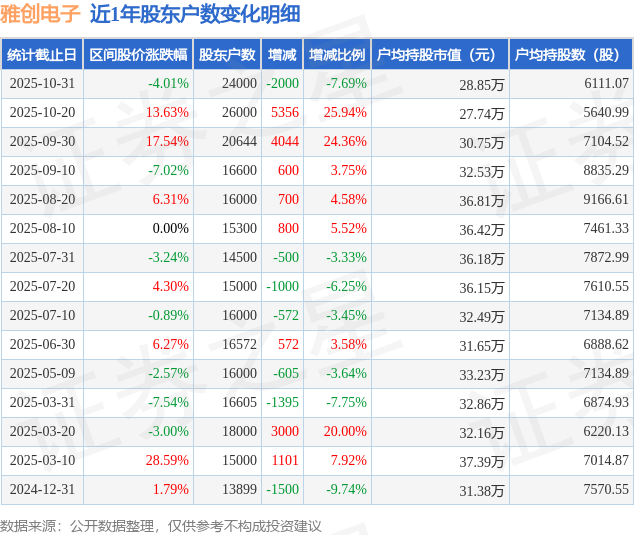从股价来看,2025年10月20日至2025年10月31日,雅创电子区间跌幅为4.01%,在此期间股东户数减少2000.0户,减幅为7.69%。