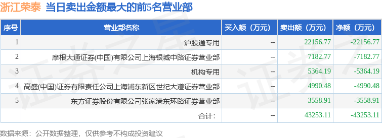 证券之星消息,沪深交易所2025年11月7日公布的交易公开信息显示,浙江荣泰(603119)因有价格涨跌幅限制的日收盘价格跌幅偏离值达到7%的前五只证券登上龙虎榜。此次是近5个交易日内第1次上榜。