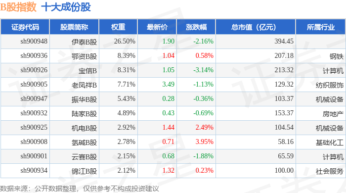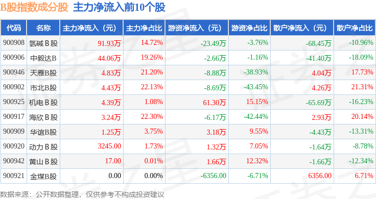 资金流向方面,B股指数(000003)成份股当日主力资金净流出合计42.95万元,游资资金净流出合计241.05万元,散户资金净流入合计284.0万元。成份股资金流向详情见下表:
