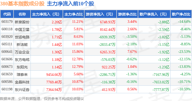 资金流向方面,380基本(000128)指数成份股当日主力资金净流出合计51.68亿元,游资资金净流入合计11.87亿元,散户资金净流入合计39.81亿元。成份股资金流向详情见下表: