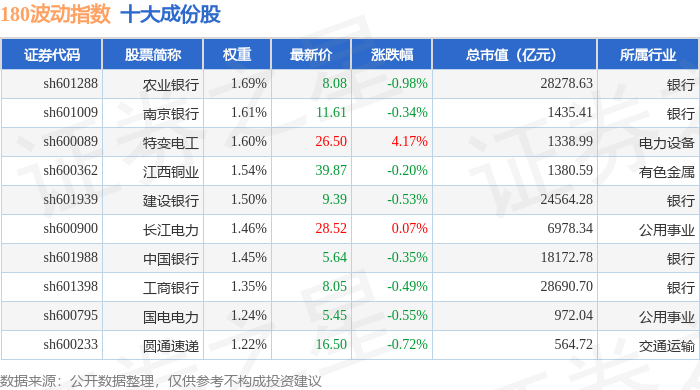 证券之星消息,11月7日,180波动(000129)指数报收于15739.72点,涨0.23%,成交1086.73亿元,换手率0.37%。当日该指数成份股中,上涨的有44家,正泰电器以8.08%的涨幅领涨,下跌的有49家,潞安环能以1.58%的跌幅领跌。