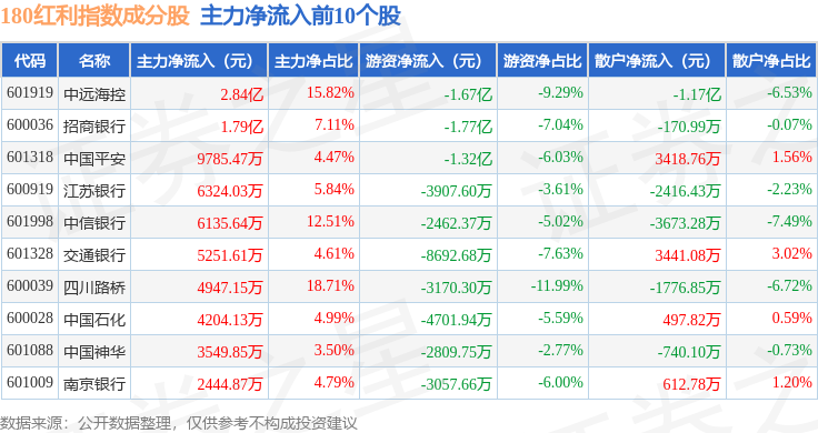 资金流向方面,180红利(000149)指数成份股当日主力资金净流出合计3480.85万元,游资资金净流出合计4.12亿元,散户资金净流入合计4.47亿元。成份股资金流向详情见下表: