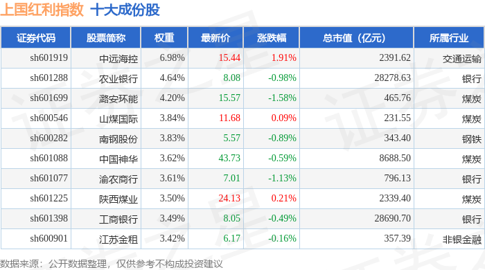 证券之星消息,11月7日,上国红利(000151)指数报收于1627.87点,跌0.13%,成交197.53亿元,换手率0.2%。当日该指数成份股中,上涨的有9家,中远海控以1.91%的涨幅领涨,下跌的有17家,潞安环能以1.58%的跌幅领跌。