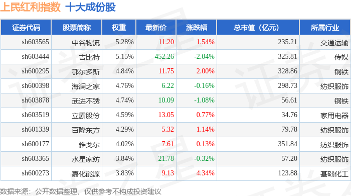 上民红利(000153)指数十大成份股详情如下: