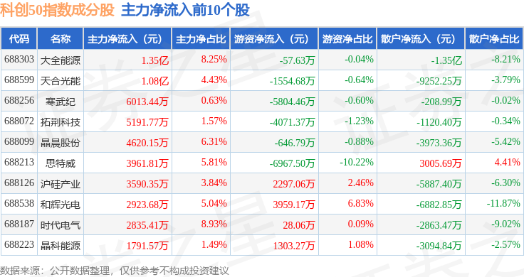 资金流向方面,科创50(000688)指数成份股当日主力资金净流出合计24.87亿元,游资资金净流入合计19.09亿元,散户资金净流入合计5.78亿元。成份股资金流向详情见下表: