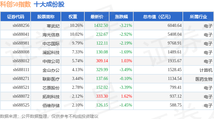 科创50(000688)指数十大成份股详情如下: