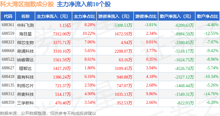 资金流向方面,科大湾区(000697)指数成份股当日主力资金净流出合计7.34亿元,游资资金净流入合计2.9亿元,散户资金净流入合计4.44亿元。成份股资金流向详情见下表:
