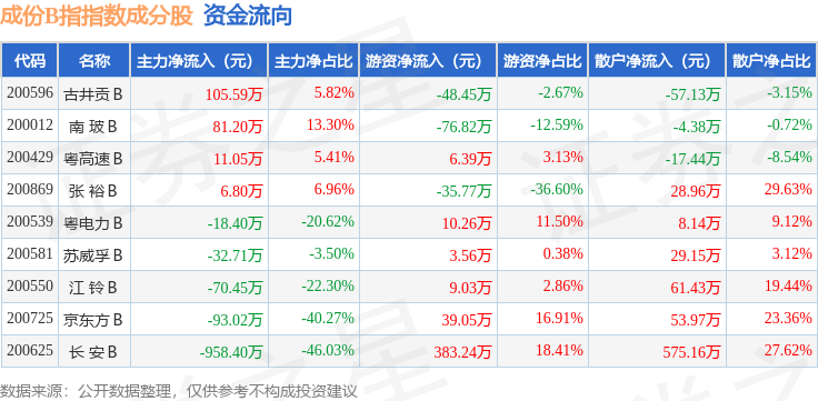 资金流向方面,成份B指(399003)指数成份股当日主力资金净流出合计968.35万元,游资资金净流入合计290.49万元,散户资金净流入合计677.86万元。成份股资金流向详情见下表: