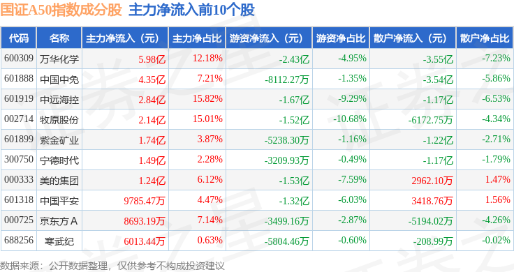 资金流向方面,国证A50(399310)指数成份股当日主力资金净流出合计57.25亿元,游资资金净流入合计17.45亿元,散户资金净流入合计39.8亿元。成份股资金流向详情见下表:
