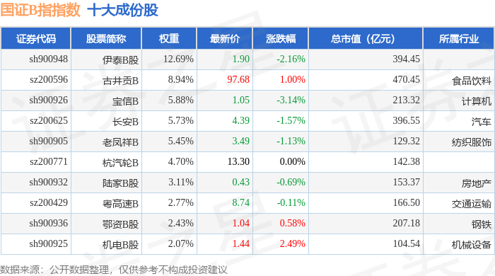 国证B指(399318)指数十大成份股详情如下: