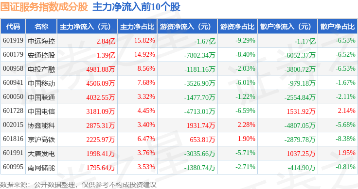 资金流向方面,国证服务(399320)指数成份股当日主力资金净流出合计8.99亿元,游资资金净流出合计1.92亿元,散户资金净流入合计10.91亿元。成份股资金流向详情见下表: