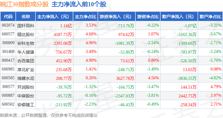 资金流向方面,皖江30(399350)指数成份股当日主力资金净流出合计14.49亿元,游资资金净流入合计3.36亿元,散户资金净流入合计11.12亿元。成份股资金流向详情见下表: