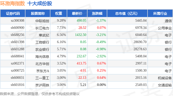 证券之星消息,11月7日,环渤海(399357)指数报收于3591.68点,跌0.27%,成交826.41亿元,换手率0.25%。当日该指数成份股中,上涨的有18家,万华化学以5.79%的涨幅领涨,下跌的有19家,金山办公以3.49%的跌幅领跌。