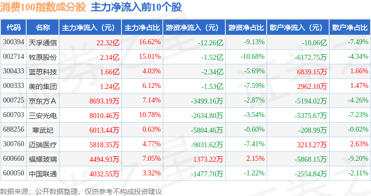资金流向方面,消费100(399364)指数成份股当日主力资金净流出合计141.38亿元,游资资金净流入合计37.36亿元,散户资金净流入合计104.02亿元。成份股资金流向详情见下表: